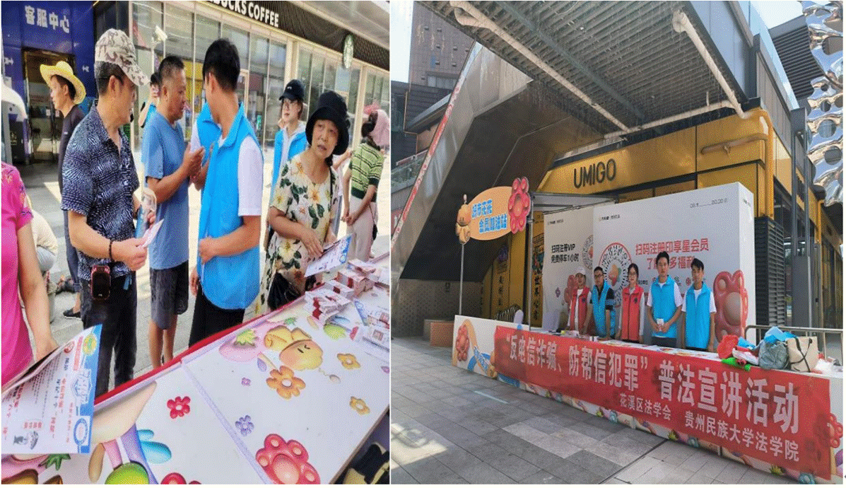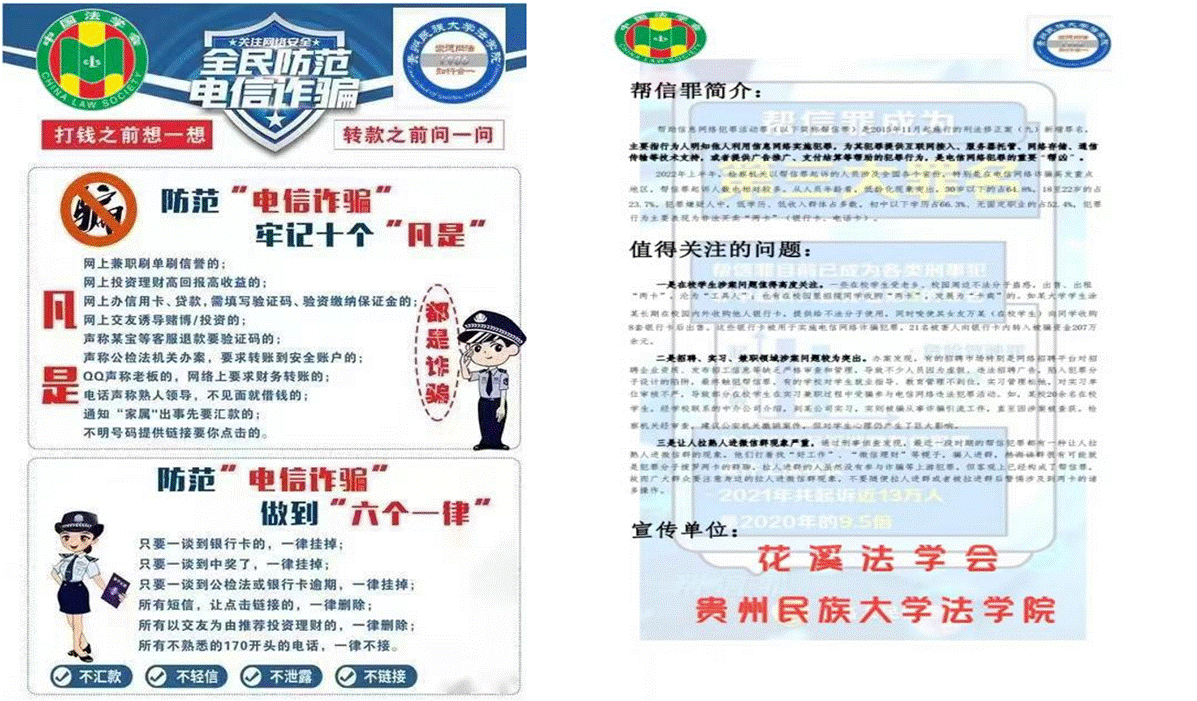 2023年8月15日至8月21日,57365z线路检测中心“反电信诈骗、防帮信犯罪普法宣讲队”在花溪区法学会的指导帮助下开展了为期6天的普法宣讲活动,共计发放宪法宣传手册、《中华人民共和国民法典》宣传手册、电信诈骗及帮信犯罪宣传单、法治物品袋共计2000份,现场接受咨询13人次,且在8月18日与清华大学“数信筑梦”社会实践团队举行了线下交流会,取得了较为圆满的普法宣传效果,便于省外同学了解贵州、宣传贵州。
