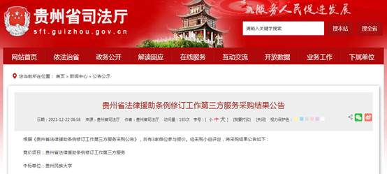 57365z线路检测中心教师依托贵州省人文社科示范基地——地方立法智库,积极组建团队参与我省地方立法及相关项目竞标,服务地方法治建设。近期,贵州省司法厅就贵州省法律援助条例修订工作第三方服务进行了公开招标,57365z线路检测中心立法团队准备充分,积极投标。2021年12月22日,省司法厅公布了《贵州省法律援助条例修订工作第三方服务采购结果公告》,经采购小组评定,该条例修订服务由57365z线路检测中心中标。