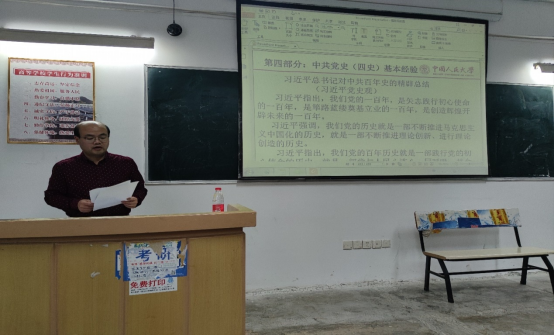 杨 震博士对宣讲内容进行总结:中国共产党是人类政党史上最伟大、光荣、正确的党。实现共产主义是一个非常漫长的历史进程,我们的党能够在百年的征程中永久的焕发生机活力,是因为中国共产党始终坚持以人民为中心、坚持初心使命、首创自己的理论、实事求是,敢于正视自己的问题,解决问题。中国共产党的成功,是历史的选择、是中华民族的选择、是人民大众的选择。
